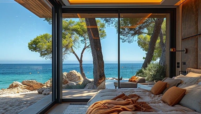 A cozy hotel room with a beautiful city view at sunset.
